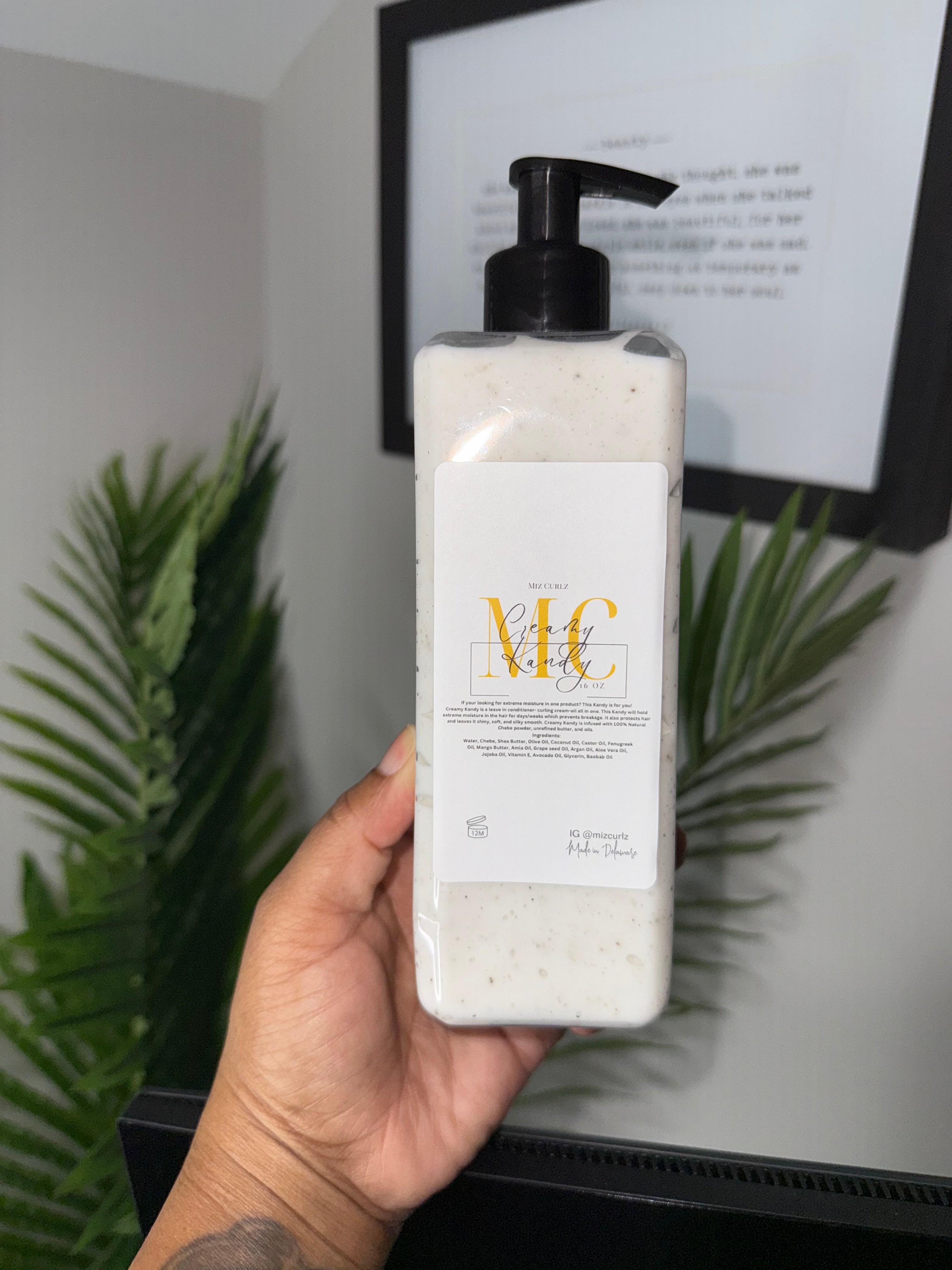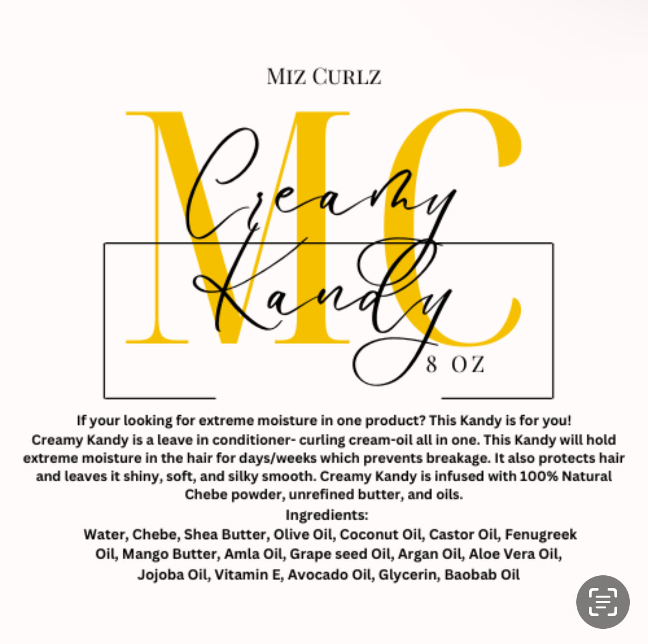 Creamy Kandy is a leave in conditioner- curling cream-oil all in one. This Kandy will hold extreme moisture in the hair for days/weeks which strengthens and prevents breakage. It also protects hair and leaves it shiny, soft, and silky smooth. Creamy Kandy is infused with 100% Natural Chebe powder, unrefined butter, and oils.